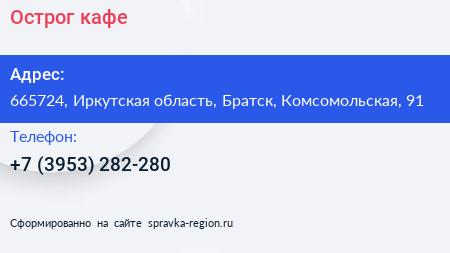 Острог, кафе по адресу 665724, Иркутская область, Братск, Комсомольская, 91 в дальнейшем Организация, размещена в следующих категориях: