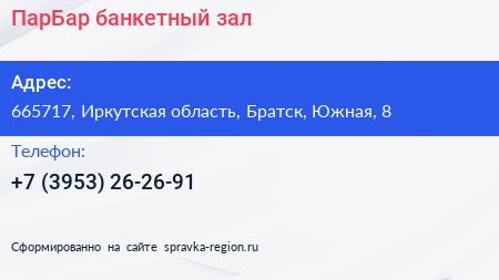 ПарБар, банкетный зал по адресу 665717, Иркутская область, Братск, Южная, 8 в дальнейшем Организация, размещена в следующих категориях: