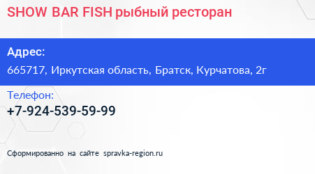 SHOW BAR FISH, рыбный ресторан по адресу 665717, Иркутская область, Братск, Курчатова, 2г в дальнейшем Организация, размещена в следующих категориях: