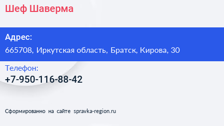 Шеф Шаверма по адресу 665708, Иркутская область, Братск, Кирова, 30 в дальнейшем Организация, размещена в следующих категориях: