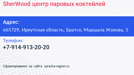 SherWood, центр паровых коктейлей по адресу 665729, Иркутская область, Братск, Маршала Жукова, 5 в дальнейшем Организация, размещена в следующих категориях: