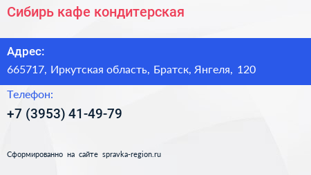 Сибирь, кафе-кондитерская по адресу 665717, Иркутская область, Братск, Янгеля, 120 в дальнейшем Организация, размещена в следующих категориях: