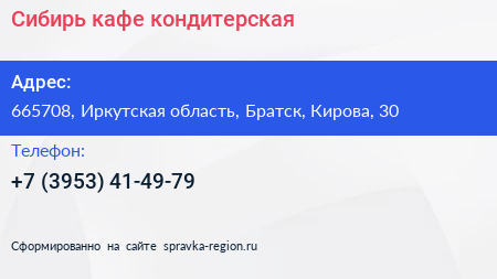 Сибирь, кафе-кондитерская по адресу 665708, Иркутская область, Братск, Кирова, 30 в дальнейшем Организация, размещена в следующих категориях: