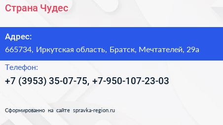 Страна Чудес по адресу 665734, Иркутская область, Братск, Мечтателей, 29а в дальнейшем Организация, размещена в следующих категориях: