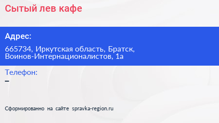 Сытый лев, кафе по адресу 665734, Иркутская область, Братск, Воинов-Интернационалистов, 1а в дальнейшем Организация, размещена в следующих категориях: