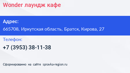 Wonder, лаундж-кафе по адресу 665708, Иркутская область, Братск, Кирова, 27 в дальнейшем Организация, размещена в следующих категориях: