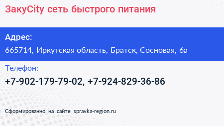 ЗакуCity, сеть быстрого питания по адресу 665714, Иркутская область, Братск, Сосновая, 6а в дальнейшем Организация, размещена в следующих категориях: