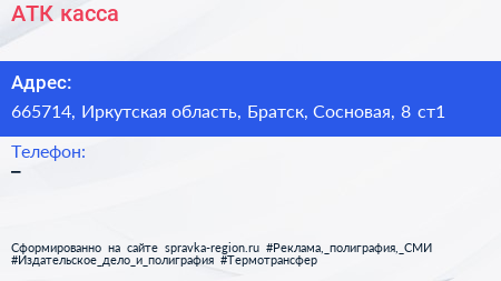 АТК, касса по адресу 665714, Иркутская область, Братск, Сосновая, 8 ст1 в дальнейшем Организация, размещена в следующих категориях: