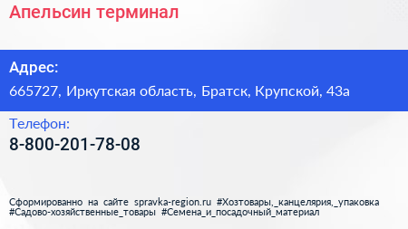 Апельсин, терминал по адресу 665727, Иркутская область, Братск, Крупской, 43а в дальнейшем Организация, размещена в следующих категориях:
