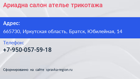 Ариадна, салон-ателье трикотажа по адресу 665730, Иркутская область, Братск, Юбилейная, 14 в дальнейшем Организация, размещена в следующих категориях: