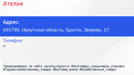 Ателье по адресу 665730, Иркутская область, Братск, Зверева, 17 в дальнейшем Организация, размещена в следующих категориях: