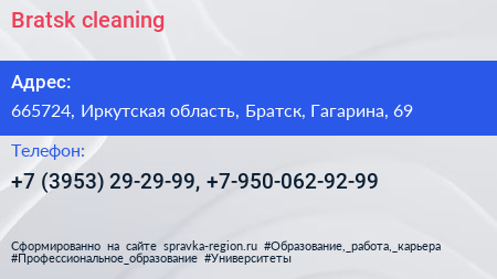 Bratsk cleaning по адресу 665724, Иркутская область, Братск, Гагарина, 69 в дальнейшем Организация, размещена в следующих категориях: