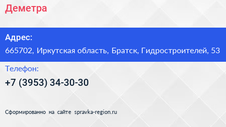 Деметра по адресу 665702, Иркутская область, Братск, Гидростроителей, 53 в дальнейшем Организация, размещена в следующих категориях: