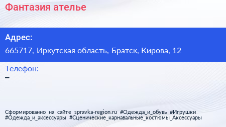 Фантазия, ателье по адресу 665717, Иркутская область, Братск, Кирова, 12 в дальнейшем Организация, размещена в следующих категориях: