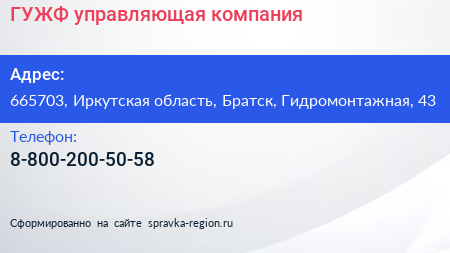 ГУЖФ, управляющая компания по адресу 665703, Иркутская область, Братск, Гидромонтажная, 43 в дальнейшем Организация, размещена в следующих категориях: