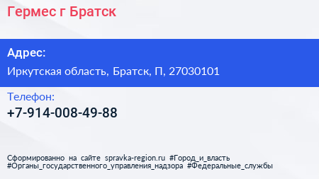 Гермес, г. Братск по адресу Иркутская область, Братск, П, 27030101 в дальнейшем Организация, размещена в следующих категориях: