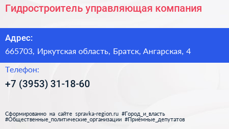 Гидростроитель, управляющая компания по адресу 665703, Иркутская область, Братск, Ангарская, 4 в дальнейшем Организация, размещена в следующих категориях: