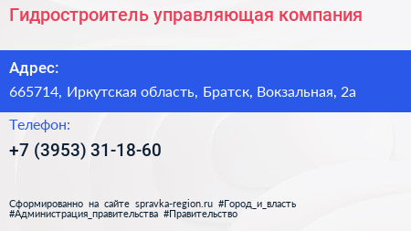Гидростроитель, управляющая компания по адресу 665714, Иркутская область, Братск, Вокзальная, 2а в дальнейшем Организация, размещена в следующих категориях: