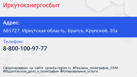 Иркутскэнергосбыт по адресу 665727, Иркутская область, Братск, Крупской, 35а в дальнейшем Организация, размещена в следующих категориях: