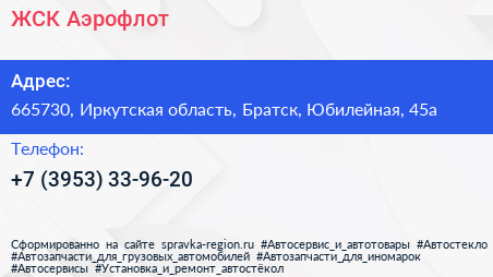 ЖСК Аэрофлот по адресу 665730, Иркутская область, Братск, Юбилейная, 45а в дальнейшем Организация, размещена в следующих категориях: