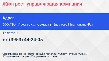 Жилтрест, управляющая компания по адресу 665710, Иркутская область, Братск, Пихтовая, 48а в дальнейшем Организация, размещена в следующих категориях: