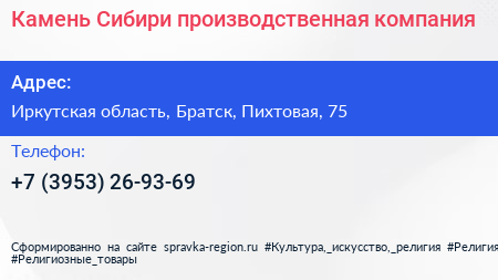 Камень Сибири, производственная компания по адресу Иркутская область, Братск, Пихтовая, 75 в дальнейшем Организация, размещена в следующих категориях: