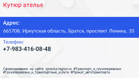Кутюр, ателье по адресу 665708, Иркутская область, Братск, проспект Ленина, 35 в дальнейшем Организация, размещена в следующих категориях: