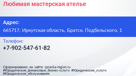 Любимая мастерская, ателье по адресу 665717, Иркутская область, Братск, Подбельского, 1 в дальнейшем Организация, размещена в следующих категориях: