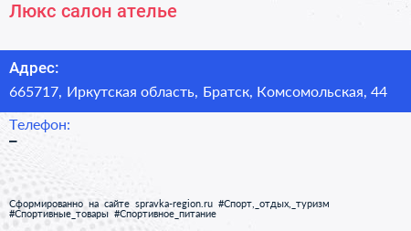 Люкс, салон-ателье по адресу 665717, Иркутская область, Братск, Комсомольская, 44 в дальнейшем Организация, размещена в следующих категориях: