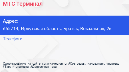 МТС, терминал по адресу 665714, Иркутская область, Братск, Вокзальная, 2в в дальнейшем Организация, размещена в следующих категориях: