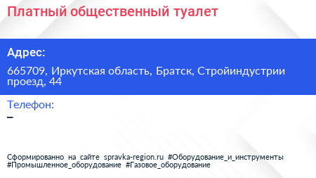 Платный общественный туалет по адресу 665709, Иркутская область, Братск, Стройиндустрии проезд, 44 в дальнейшем Организация, размещена в следующих категориях: