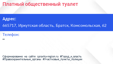 Платный общественный туалет по адресу 665717, Иркутская область, Братск, Комсомольская, 62 в дальнейшем Организация, размещена в следующих категориях: