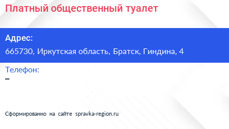 Платный общественный туалет по адресу 665730, Иркутская область, Братск, Гиндина, 4 в дальнейшем Организация, размещена в следующих категориях: