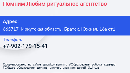 Помним... Любим..., ритуальное агентство по адресу 665717, Иркутская область, Братск, Южная, 16а ст1 в дальнейшем Организация, размещена в следующих категориях: