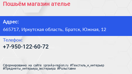 Пошьём?!, магазин-ателье по адресу 665717, Иркутская область, Братск, Южная, 12 в дальнейшем Организация, размещена в следующих категориях: