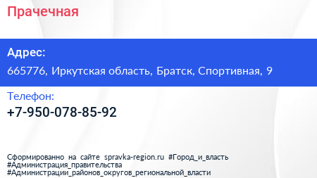 Прачечная по адресу 665776, Иркутская область, Братск, Спортивная, 9 в дальнейшем Организация, размещена в следующих категориях: