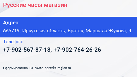 Русские часы, магазин по адресу 665719, Иркутская область, Братск, Маршала Жукова, 4 в дальнейшем Организация, размещена в следующих категориях: