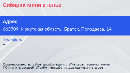 Сибиряк, мини-ателье по адресу 665709, Иркутская область, Братск, Погодаева, 14 в дальнейшем Организация, размещена в следующих категориях: