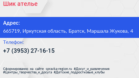 Шик, ателье по адресу 665719, Иркутская область, Братск, Маршала Жукова, 4 в дальнейшем Организация, размещена в следующих категориях: