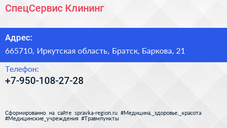 СпецСервис-Клининг по адресу 665710, Иркутская область, Братск, Баркова, 21 в дальнейшем Организация, размещена в следующих категориях: