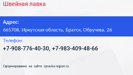 Швейная лавка по адресу 665708, Иркутская область, Братск, Обручева, 26 в дальнейшем Организация, размещена в следующих категориях: