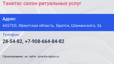 Танатос, салон ритуальных услуг по адресу 665710, Иркутская область, Братск, Шаманского, 2а в дальнейшем Организация, размещена в следующих категориях: