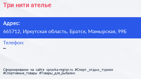 Три нити, ателье по адресу 665712, Иркутская область, Братск, Мамырская, 99Б в дальнейшем Организация, размещена в следующих категориях: