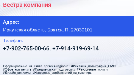 Вестра, компания по адресу Иркутская область, Братск, П, 27030101 в дальнейшем Организация, размещена в следующих категориях: