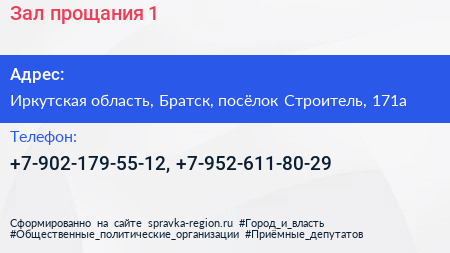 Зал прощания №1 по адресу Иркутская область, Братск, посёлок Строитель, 171а в дальнейшем Организация, размещена в следующих категориях: