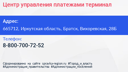 Центр управления платежами, терминал по адресу 665712, Иркутская область, Братск, Вихоревская, 28Б в дальнейшем Организация, размещена в следующих категориях: