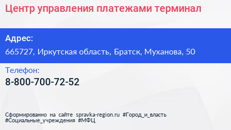 Центр управления платежами, терминал по адресу 665727, Иркутская область, Братск, Муханова, 50 в дальнейшем Организация, размещена в следующих категориях: