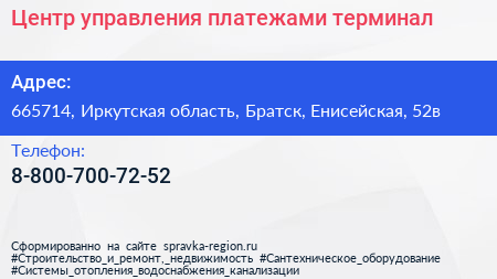 Центр управления платежами, терминал по адресу 665714, Иркутская область, Братск, Енисейская, 52в в дальнейшем Организация, размещена в следующих категориях: