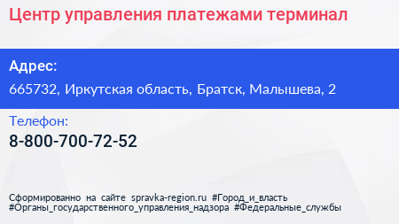 Центр управления платежами, терминал по адресу 665732, Иркутская область, Братск, Малышева, 2 в дальнейшем Организация, размещена в следующих категориях: