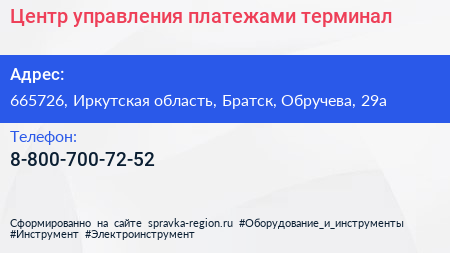 Центр управления платежами, терминал по адресу 665726, Иркутская область, Братск, Обручева, 29а в дальнейшем Организация, размещена в следующих категориях: